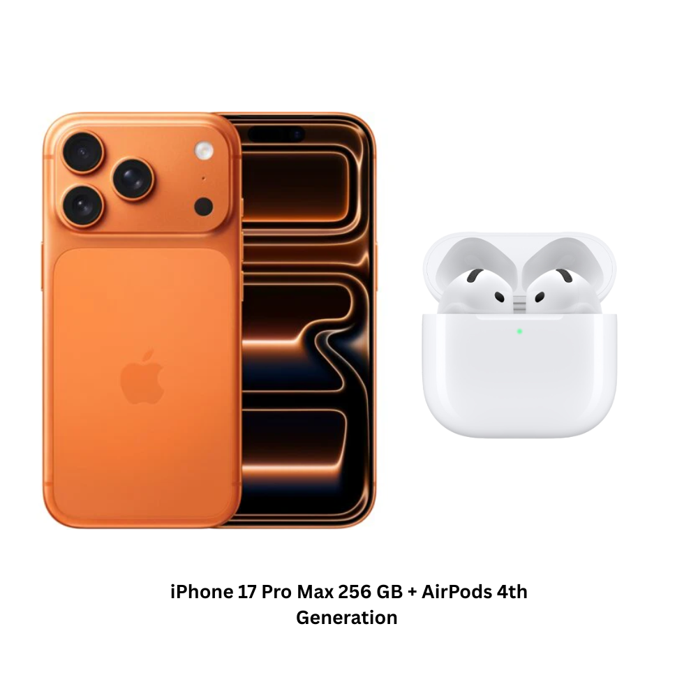 Experience next-generation power with the iPhone 17 Pro Max 256GB in Cosmic Orange, paired with AirPods 4th Generation for premium sound and effortless wireless connectivity. Built with Apple’s fastest chip, stunning display quality, and advanced camera system, this bundle delivers performance, style, and audio excellence in one complete package.